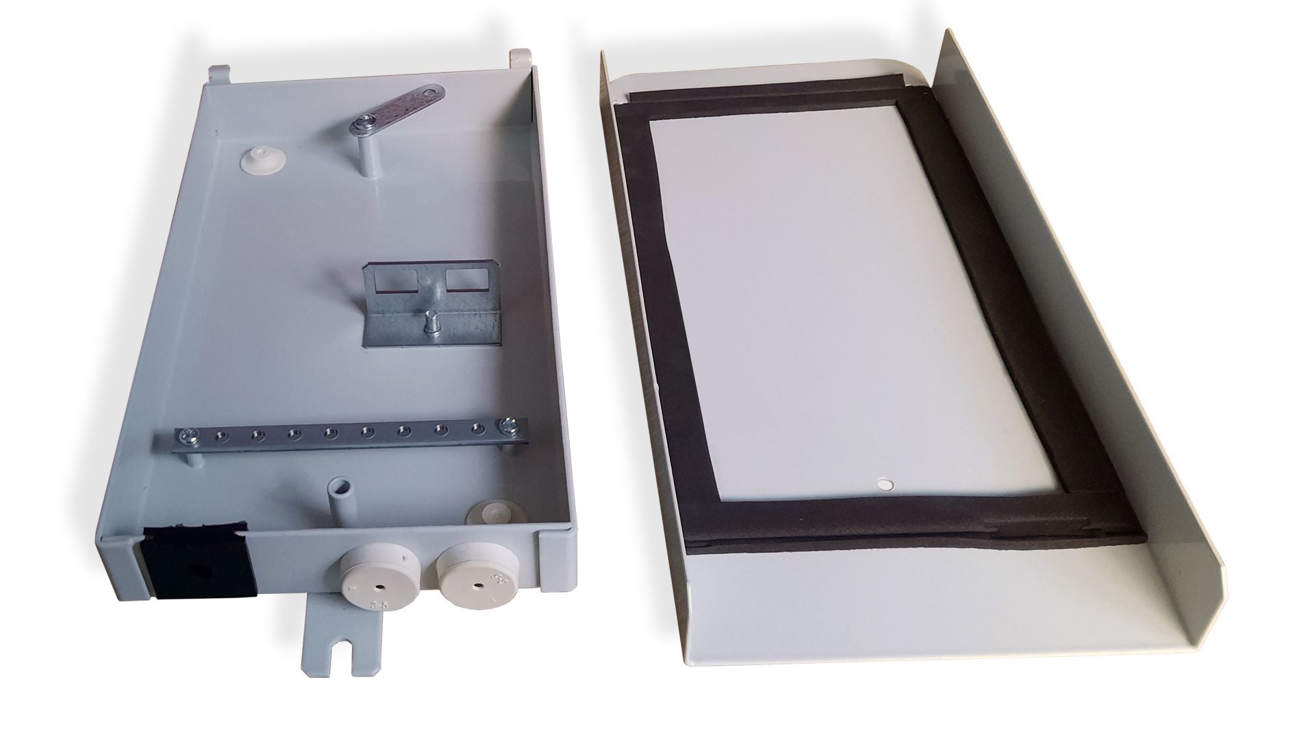 Alumiininen päätekotelo huoneistojakamoihin, jossa on riittävästi tilaa hitsauksille. Kotelossa on tilaa kahdelle SC-duplex / LC-quadruplex adapterille. Kotelon mitat ovat 115 x 120 x 18 mm